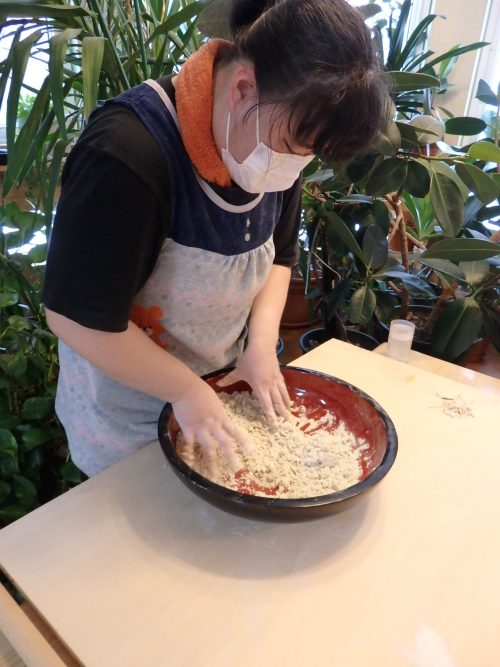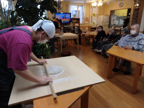 そばうち 2026.01.07 未分類 12月30・31日にそばをうちました。 30日はひかりスタッフがうち、31日は施設長のお孫さんがうってくださいました。 31日のお昼にうったそばを召し上がって頂くと皆様、「美味しい~ね~。もう年越しなんだね~。」と話されていました。 ≪ クリスマス会兼お誕生会 2026年 正月料理 ≫
